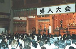 続いて、三宅壽賀子婦人会連合会長(三宅龍雄教会長夫人)による挨拶と、今年度最優秀会員の表彰が行われた。特に、今回の婦人大会は、昨年8月末に、先代教会長故三宅歳雄師が帰幽(死去)してから最初の婦人大会に当たり、三宅連合会長は、先代教会長への報恩感謝を強調した。