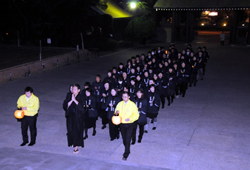 2010年12月23日、冬至の翌日ゆえ、辺りはすっかり暗くなった午後5時50分、祈りの塔拝礼殿前の参道には、「御神願」と白く染め抜かれた法被(はっぴ)姿の60名の青年会員および若婦人会員が集結して、火の出るようなご祈念を上げた。親先生は、拝礼殿正面の石貼りの犬走りに直に正座されて、共にご祈念を頂かれている。「泉光園御遷座六十年」献燈隊行列の出発である。