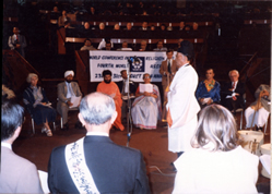 私が今は亡き三宅歳雄先生とご縁を頂戴して早や25年の歳月が経ちました。1984年(昭和59年)、ケニアのナイロビで開催された第4回WCRP(世界宗教者平和会議)世界大会の折に、三宅歳雄先生はWCRPの財務委員長に就任されました。その大会は、小さい予算であったにもかかわらず、全世界から、特にアフリカ各国から―彼らの多くはこのような諸宗教対話の大きな会議に参加するのは初めての体験でしたし、ましてや神道の指導者にお目にかかるのも初めてでしたが―300人以上の参加者を集めることに成功したのは、三宅歳雄先生の格別の財的貢献に拠るところが大であります。