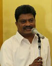 祝宴で謝辞を述べる三宅光雄教会長と善信師・修師