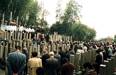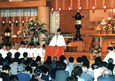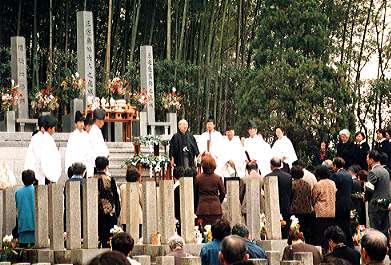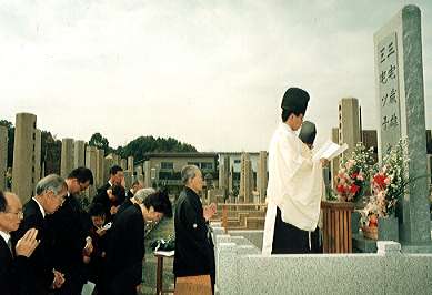 まず、泉尾教会信徒墓地で、この度、新たに設けられた先代教会長故三宅歳雄師の奥城(おくつき=墓所)の建碑式ならびに改装された信徒納骨所の清祓式を兼ねる墓前祭が、三宅光雄副教会長祭主のもとに仕えられた。また、三宅龍雄教会長による教話が行われ、参拝者全員が、新装された納骨所を見学した。