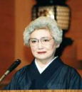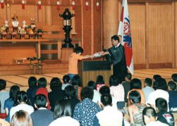 続いて、三宅壽賀子婦人会連合会長(三宅龍雄教会長夫人)による挨拶と、今年度最優秀会員の表彰が行われた。特に、今回の婦人大会は、昨年8月末に、先代教会長故三宅歳雄師が帰幽(死去)してから最初の婦人大会に当たり、三宅連合会長は、先代教会長への報恩感謝を強調した。
