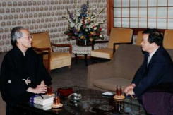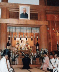 9月14日(木)、浄土真宗本願寺派の安部恵証内事部長が参拝された。大谷光真門主の名代として来訪した安部師は、7月25日に葬儀が行われた故大谷嬉子前裏方への三宅龍雄教会長の弔意への謝辞と、このたび一年祭を終えた先代教会長の霊前への参拝を行った。