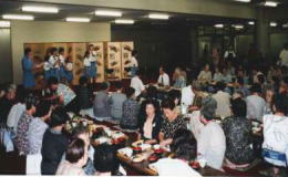 祭典後、三宅龍雄教会長からひとりひとり「お祈りの握手」を受けた長寿者たちは、感激もひとしお…。その後、会場を一階ホールに移して、昼食会を兼ねた「敬老感謝のつどい」が行われ、楽しい一日を過ごした。