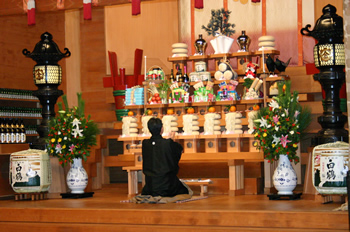 元日の早朝、今年最初のご祈念をする三宅光雄教会長。(1月1日) 元旦祭で年頭の教話をする祭主三宅光雄教会長。(1月1日) 三賀日の間は年頭のお書き下げを頂く参拝者で終日賑わった泉尾教会の広前。