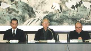 3月29日、泉尾教会国際会議場において、WCRP日本委員会(理事長白柳誠一カトリック枢機卿)の第61回理事会並びに第59回評議員会が開催され、日本宗教界を代表する数十名の宗教指導者が一同に会した。また、同委員会の常務理事各師が、WCRPの創設者である三宅歳雄名誉会長を表敬訪問した。 理事会・評議員会に先立ち、WCRP日本委員会常務理事会が開催され、重要案件が審議された。同会議終了後、白柳理事長はじめ常務理事の庭野日鑛立正佼成会会長、西田多戈止一燈園当番、石田昇妙智會教団理事長(同教団宮本丈靖会長の名代)の各師は、WCRP運動の創始者のひとりである三宅歳雄名誉会長を表敬した。 理事会・評議員会では、財団法人「世界宗教者平和会議日本委員会」の役員(任期三年)の人事改選が行われた。また、11月にヨルダンのアンマンで開催される第7回WCRP世界大会の際に選出されるWCRP国際委員長への日本委員会からの推薦リストには、国際管理委員会(国際委員長団によって構成)委員として、現職の三宅龍雄人類共栄会会長と庭野日鑛立正佼成会会長、それに加えて白柳誠一枢機卿の三師が推薦された。 午後からは、信修館を会場に第25回「平和のための宗教者研究集会」が『人間の責任と宗教』のテーマで開催され、塩川正十郎元文部大臣などのゲストや上田賢治國學院大学学長をはじめとする講師の学者および約百名の宗教関係者が参加し、具体的な問題について理解を深めた。 |