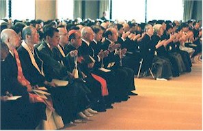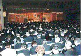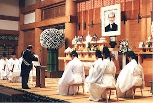 特別会葬者席には、各宗派・学界・政界の代表や各国からの外交団も参列し、神式の葬儀は荘厳な雰囲気で進行した。宮本丈靖妙智会教団会長らが弔辞を述べたあと、遺族親族、特別会葬者、一般参拝者が玉串を奉奠したが、一度に30人ずつ玉串を奉奠したにもかかわらず、全員が玉串を上げ終わるのに、1時間半も時間を要した。 |