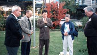 三宅理事長は、WCRP日本委員会の開発環境委員会副委員長として、以前から熱心に地球環境問題に取り組んでいるが、2年前に京都で開催されたCOP3会議の際には、同NGO会議の宗教委員会副委員長として、祈りの集会を計画したり、神職・僧侶・神父などを動員して京都市内でアピール行進を実施させるなどの経歴がある。 昨年、アルゼンチンのブエノスアイレスで開催されたCOP4に続いて、これで3大会連続の出席となり、同会議に参加している世界各国からの宗教者による「祈り」の集いを、今回も実現させた。 |