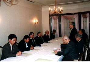 大阪国宗平成10年度第2回例会開催 大阪国宗の平成10年度第2回例会は、10月13日(火)に金光教泉尾教会神徳館2F国際会議場にて、社会心理学者の金児暁嗣大阪市立大学文学部長を講師に迎えて「日本人の宗教性とその心理的効果」と題して開催された。 金児氏は、社会統計学的な数値を用いた実証的研究で、現代日本社会の諸宗教現象について、鋭い分析を行った。(部分掲載) 11月2日、サンフランシスコを拠点に活動するJARF(日米宗教連盟:11教団が加盟)の訪日代表団11名が、金光教泉尾教会(三宅歳雄教会長)を訪問。大阪国際宗教同志会(津江孝夫会長)のメンバーと日米交流会を行った。 十日間の予定で、日本各地の教団(立正佼成会・西本願寺・天理教等)を訪問していたJARFの訪日代表団(L・S・ササキ団長)は、二日の夕方、大阪入りし、最後の訪問先である金光教泉尾教会に参拝した。 午後六時半から、同教会の神徳館国際会議場にて、大阪国際宗教同志会のメンバーと交流会を行った。大阪国宗理事の三宅善信師。まず、アメリカ側のR・ハント牧師(メソジスト教会・シアトル)の開会の祈りが行われた。続いて、大阪国宗理事長の三宅龍雄金光教泉尾教会副教会長が歓迎の挨拶を、また、答礼の挨拶をJARF代表団団長のL・S・ササキサンフランシスコ仏教会会長(浄土真宗本願寺派)が行った。 続いて、ササキ団長からアメリカ側メンバーの紹介が、大阪国宗側からは三宅善信理事が英語で日本側参加者の紹介と大阪国宗の歴史と活動について報告を行った。コーヒーブレイクを挟んで、日米双方からの質疑応答に移り、米国に進出している日本宗教の現場での困難や課題などについて積極的に話し合われた。この日の大阪国宗側の参加教団は、金光教・本門佛立宗・法華宗・曹洞宗・臨済宗・辯天宗・神道石切教・神社神道・カトリックの九教団であったが、各教団とも英語に堪能な若手を派遣したこともあって、短時間のプログラムの割にはかなりの成果を上げた。 最後に、日本側を代表して三宅龍雄大阪国宗理事長とアメリカ側を代表して副団長のパシフィック神学校のR・ナカソネ教授が、閉会の挨拶を行った。また、閉会の祈りは、法華宗太平寺の上田恵猛副住職が英語で行い、無事、終了した。 12月21日(月)午後5時から、リーガロイヤルホテル(大阪市北区)において、大阪国際宗教同志会の平成10年度第4回の理事会が開催された。 開会に先立ち、上田恵亮理事(法華宗太平寺住職)による「平和の祈り」が行われ、三宅龍雄理事長(金光教泉尾教会副教会長)が開会の挨拶を行った。続いて、事務局から、平成10年度の事業報告と決算報告が行われた。 次に、平成11年度の事業計画・予算が審議され、可決された。例年通り、3回の講演会を含む例会(うち1回は総会)の開催と、モンゴル仏教最高指導者カンポ・ラマ法王からの招きで、7月に訪蒙することが了承された。また、直前に行われた米英両国のイラクへの攻撃等についても話し合われた。 閉会の挨拶を平岡英信常任理事(清風学園理事長)が行い、「平和の祈り」を岸英司理事(英知大学学長)が行って、理事会は終了した。 戻る |