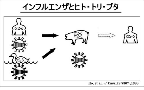 それから、中国から起きた1957年の「アジア風邪」、1968年の「香港風邪」、1977年の「ロシア風邪」―当時は「ソ連風邪」と呼ばれていましたが、現在は「ロシア風邪」と呼ばれています―は、いずれもH1N1やH3N2といった組み合わせの4種のカモのウイルスが、いったんブタに感染した後にブタからヒトへ感染が起こっています。「何故、ブタが感染するのか?」といいますと、ブタの体内には2―3の結合しているシアル酸とガラクトースのレセプターと、2―6の結合しているヒト型のレセプターの両方が気道にあります。