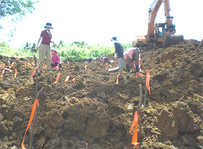 そして、その現場に着いてみると、日本人が全部で15人ぐらい。後はフィリピン側の「スタッフ」と呼ばれる政府派遣団にくっついている方々、そして軍の護衛…。全部合わせると三十数名でしたが、その方々が小さな穴を取り巻いて見ているんです。何をしているのかと覗きに行くと、その穴の中で現地のフィリピン人の方が一生懸命作業しています。派遣団一行の人たちは穴の外に立って眺めているだけ…。「何だかおかしな構図だな…」と思いながら取材を始めましたが、奇妙なことに、それまで私がフィリピンへ3回足を運んで実際に見てきた遺骨があった場所から推定しても、通常の軍事的戦略面から考えても、何故こんな所に遺骨があるのかというような所で、ひたすら穴を掘っておられました。当然ですが、何も出てきません。