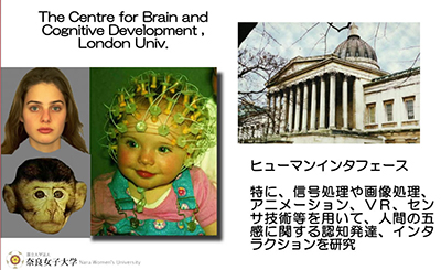 最初の在外研究はロンドン大学だったのですが、「その脳認知発達研究所で何をしていたのか?」とよく聞かれます。本日は切り口として、この辺りから入らせていただきます。脳認知発達研究所を英語で表記しますと「The Centre for Brain and Cognitive Development」となり、正式な略称は頭文字を取った「CBCD」なのですが、一般にはこの呼びにくい名前ではなく「ベビー・ラボ(赤ちゃん研究所)」と呼ばれています。この写真の頭にいっぱい電極を付けた赤ちゃんはいったい何をしているところかといいますと、西洋人の女性の顔とお猿さんの顔を見せて、果たして見分けられるのか。西洋人の女性の顔を「自分の仲間」と思うか、それとも「これは猿だから自分の仲間ではない」と思うのか、そういうことを調べている研究所に招聘(しょうへい)されて行ってまいりました。