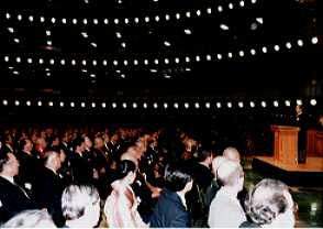 3月13日、東京都杉並区の立正佼成会本部において、内外各界の代表を招き、同会の創立六十周年記念式典が開催された。 午後六時から、同会「大聖堂」において記念式典が挙行された。昭和三十九年に竣工した立正佼成会の根本道場「大聖堂」には、各宗派の代表や政界・国際機関の代表などの 招待客約六百名が参列。まず、庭野日鑛会長の先導でご本尊に「題目三唱」。続いて、記念ビデオ『おかげさまで六十年』が放映された。最後に、庭野会長が挨拶を行って、記念式典が終了した。 続いて、会場を同会の迎賓館である「法輪閣」に移し、記念祝宴が行われた。祝宴では、同会の酒井教雄理事長の歓迎の言葉に始まって、中曽根康弘元首相とWCRP日本委員会理事長の 白柳誠一枢機卿(カトリック東京大司教)が祝辞を述べ、日本宗教連盟理事長の廣瀬靜水人類愛善会会長の発声で乾杯が行われた。 |