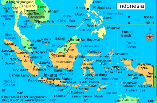 インドネシアの島々の間には、この文化史的な境界線だけでなく、生物学的な意味での境界線もあって、興味が尽きない地域である。太古の昔、現在のインドシナ地域とオーストラリア大陸は、陸続きであった。その名を「スンダ大陸」と呼ばれている。ところが、地球規模での地殻変動に基づく大陸移動と、間氷期の温暖化による海面上昇によって、現在のインドシナ、マレー半島の先端部からオーストラリアへと続く島々、すなわち西から順に、スマトラ島、ジャワ島、バリ島、ロンボク島、そして、今年5月に「独立」を果した「東チモール」のあるチモール島をはじめとする南側の流れと、その北側に平行して、カリマンタン(ボルネオ)島、スラウェシ(セレベス)島、アンボン島など多くの島々を経て、パプア・ニューギニア、そしてオーストラリアへと至る一連の地域が、海によって切り離されてインドネシアを構成する島々となった(実はフィリピン諸島も、この流れの続きの島々であるからして、南部のミンダナオ島あたりにイスラム教徒がたくさん住んでいても、なんの不思議もない)。