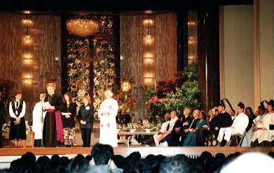 その壇上に諸宗教からの代表者たちが並び、献灯献花の後、妙智會教団が初めに祈りを捧げ、継いで、仏教・キリスト教など10グループに分かれて各宗教の祈りが続いた。代表者が祝詞やお経をあげるグループ、全員が順に祈りの言葉を唱えるグループ、中には歌を歌うグループもあり、ユダヤ教の代表者たちはギターの伴奏に合わせて歌った。それぞれ、お祈りの形式も言葉も違うけれど、会場にいた全ての人が、どの祈りにも熱心に耳を傾けていた。